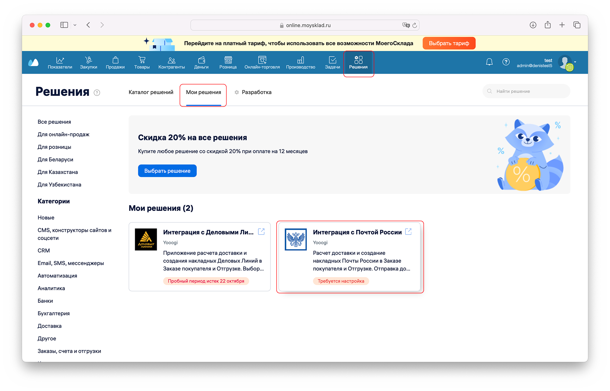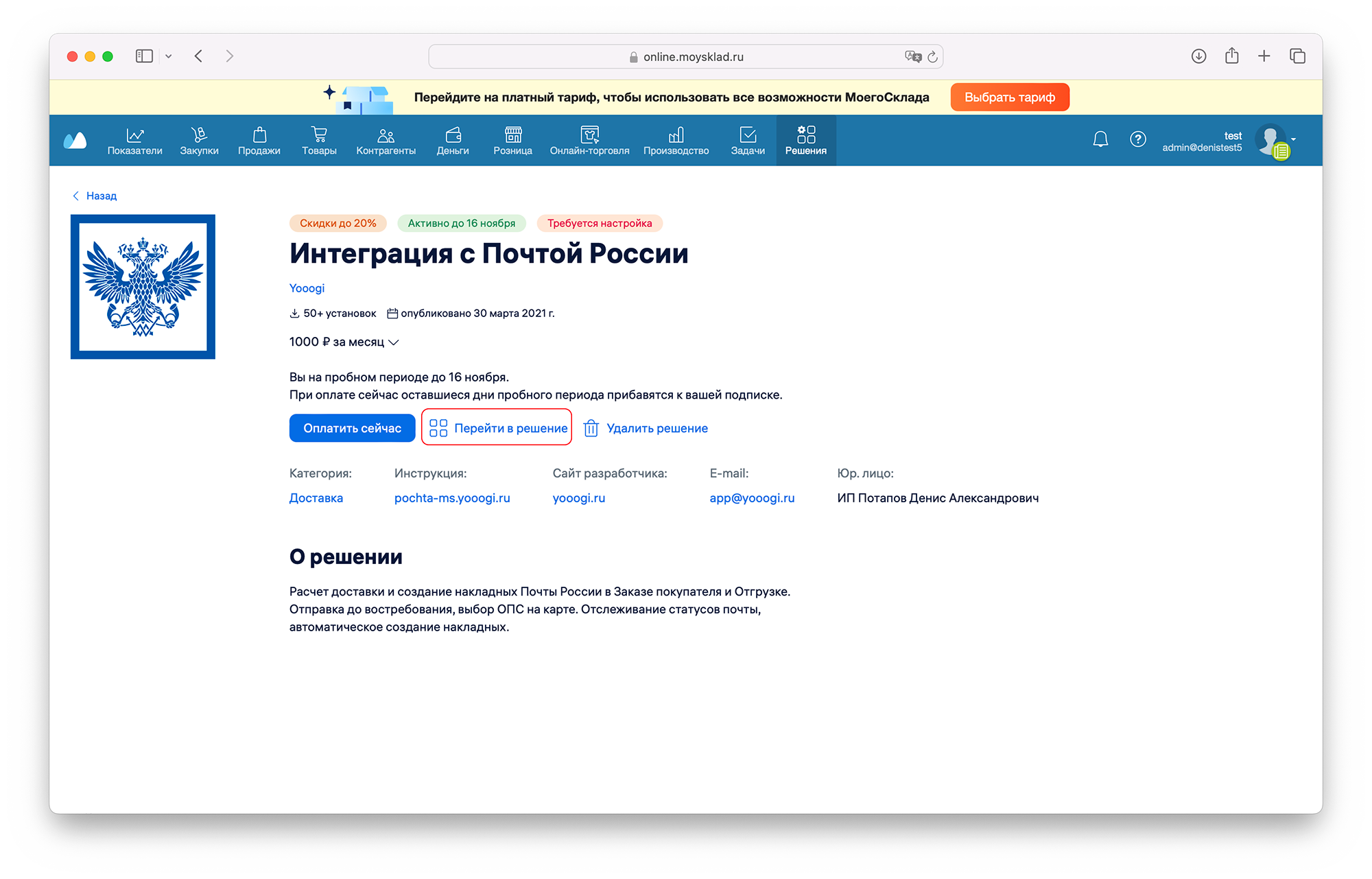 В открывшемся каталоге перейдите в карточку "Интеграция с Почтой России" (Yooogi)