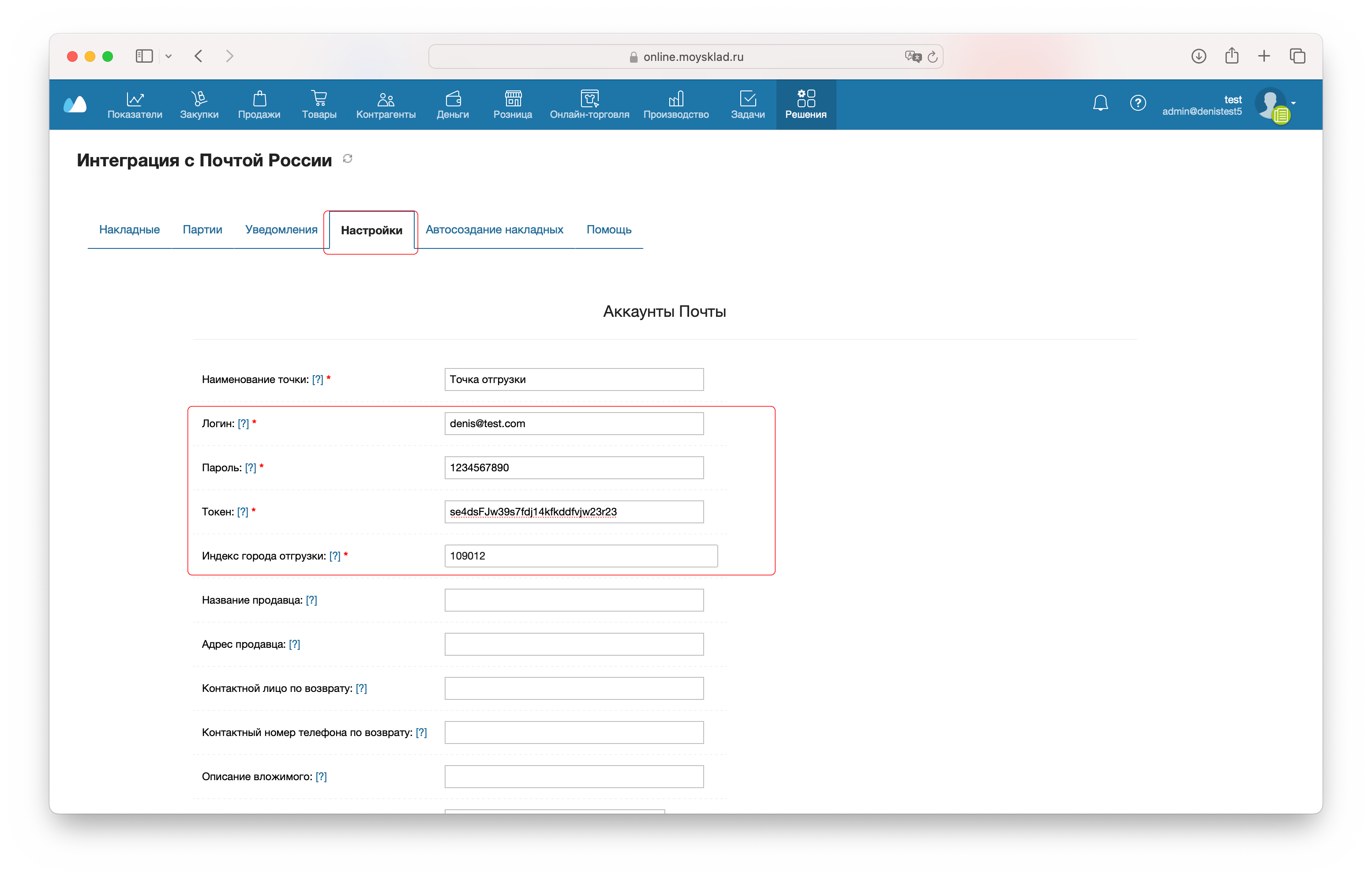На открывшейся странице раздела "Настройки" укажите данные учетной записи otpravka.pochta.ru